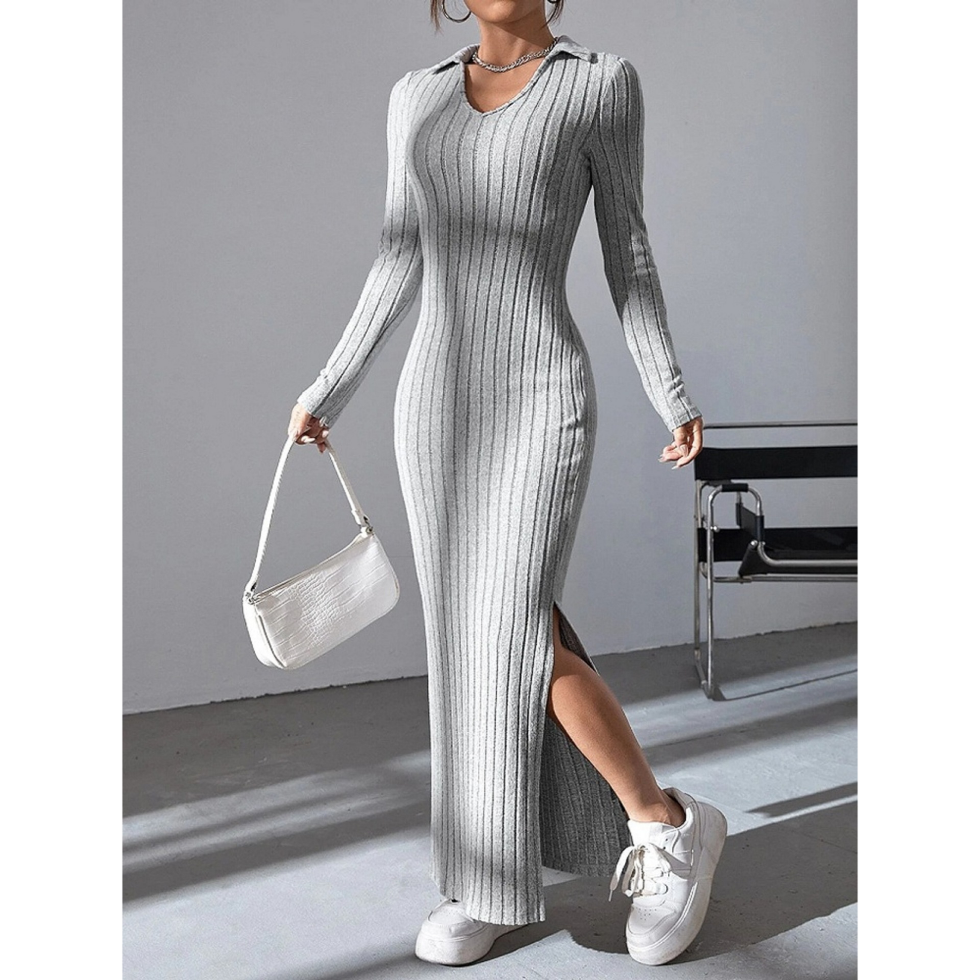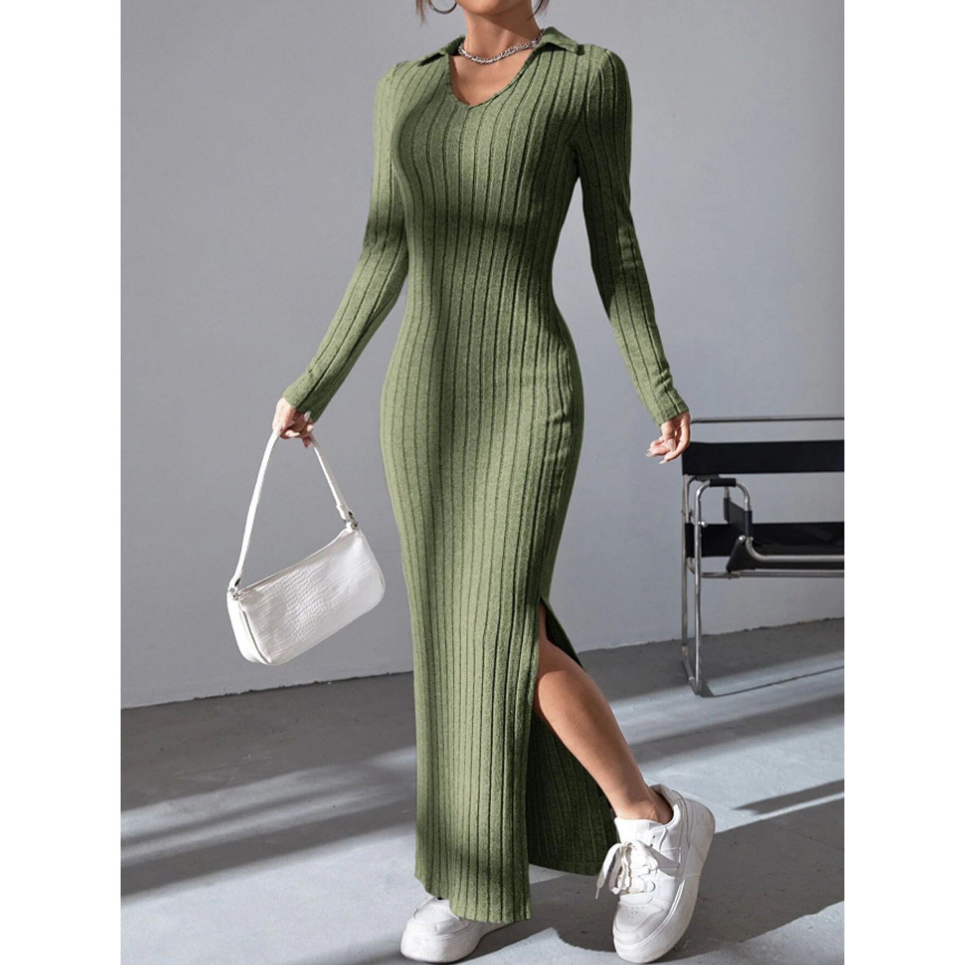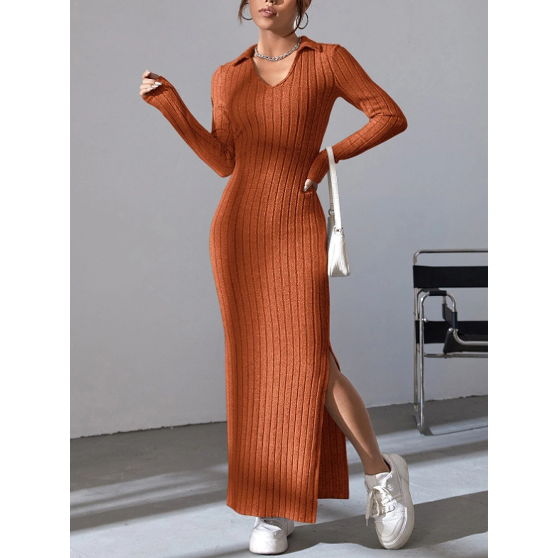 2024 sonbahar ve kış sezonunun favorisi olan bu Slim-Fit örme elbise, Avrupa ve Amerika modasının zarif çizgilerini bir araya getiriyor. Uzun kollu ve yaka detaylı tasarımı, vücudu saran çukur şerit dokusuyla hem şık hem de modern bir görünüm sunar. Düz renkleriyle her tarza uyum sağlayan bu sıkı elbise, soğuk havalarda hem rahatlık hem de stil arayan kadınlar için mükemmel bir seçim.
